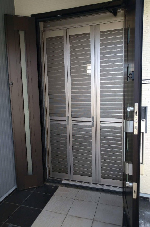 玄関ドアに、折戸式網戸を設置しました。 一般的にはジャバラ式の網戸が多く使われていますが、強度と防犯性に優れたセイキ販売の『リリーブVFパンチングタイプ』の網戸を採用しました。このリリーブVFタイプは、従来のネット網戸に比べて破れにくく防犯面でも安心できる仕様になっています。
